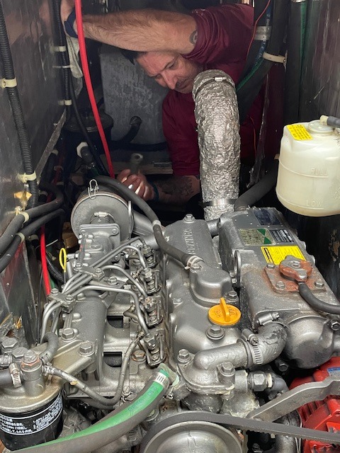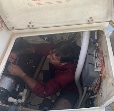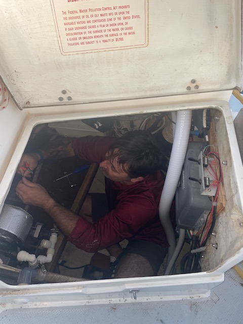 He worked on the engine too, which had been leaking oil but doesn’t now. It also got new coolant lines. Then there were the electrical wiring projects: adding a breaker, wiring navigation lights, adding an on and off switch for the anchor wash down water pump. Yeah, that’s a thing. The Professor also managed to fix the aft A/C. And clean all the stinky bilges.