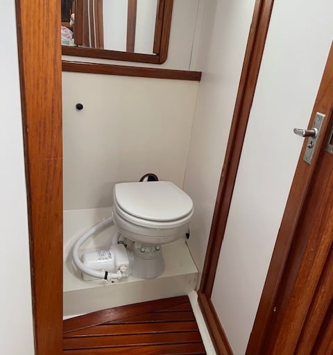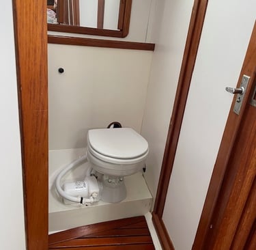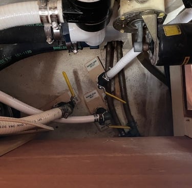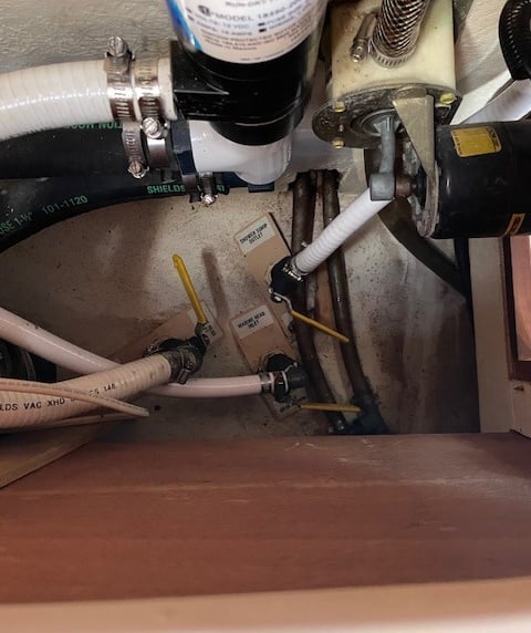 Meanwhile, we replaced the leaky manual aft head with a new Jabsco Electric Flush toilet along with all the sanitation and supply lines to both the aft and forward heads. In fact, we have replaced just about every water line on the boat.…if it drains, fills or vents, we’ve replaced it. The professor estimates about 135 feet of hose all together. And when I say we, I mean he replaced 135 feet of hose.
