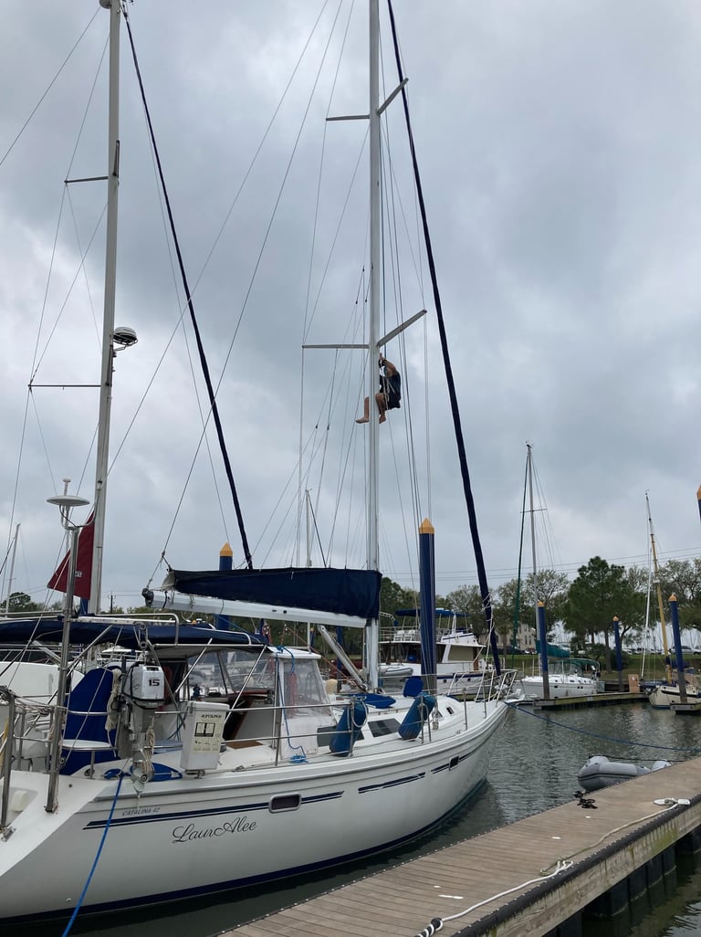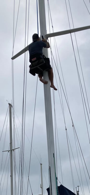 The only thing scarier than having to go up the mast in a Bosan's chair is having to buy one, which like everything boat related, is pretty expensive. Thankfully we were able to borrow one.