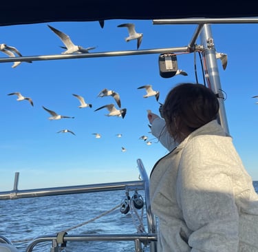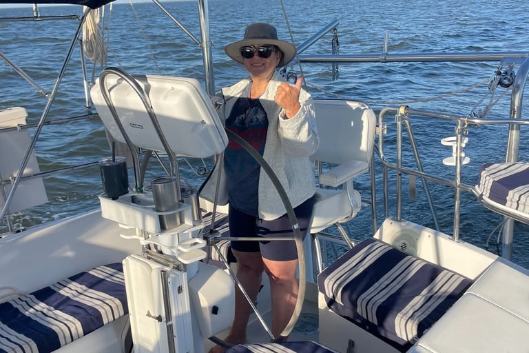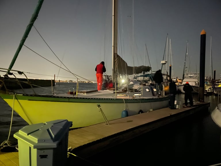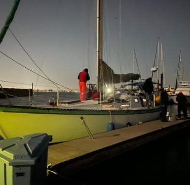 We returned to find the weather had warmed up significantly and decided to do a little sailing on our own just out in the bay. It was pleasantly uneventful, almost. We did have the small issue of the streaming light being knocked off the mast by the headsail, (don't ask, I don't know).