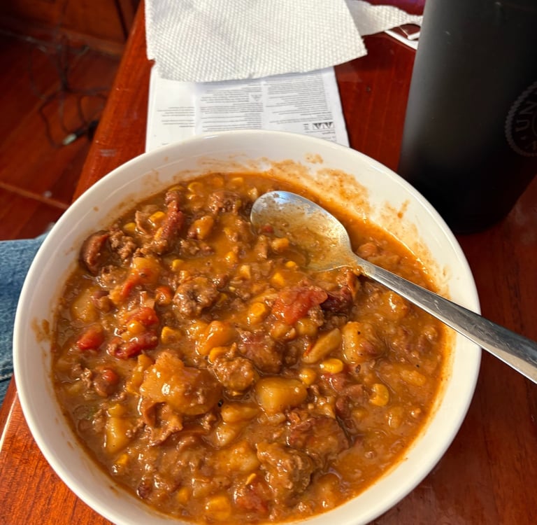 I loaded him up with cans of tuna salad and crackers, nuts and beef jerky. Then I called the captain of Ces’t Si Bon and asked if the crew would like breakfast burritos for their early morning departure. I was told it would be very much appreciated. I chose a recipe that has a high calorie content, I thought it would be a good, stick-to-your-bones kind of meal; Chris said it tastes more like a Sloppy Joe than breakfast, but it "wasn't bad, just different".