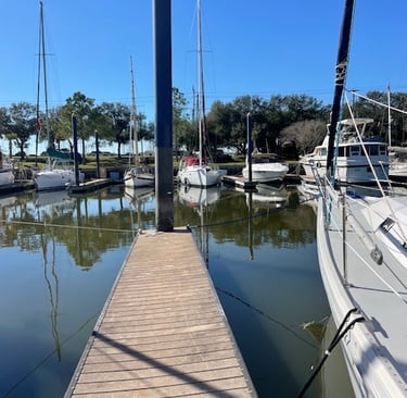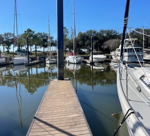 Not having a generator on board meant we could only run essentials like the fridge and water pump in order to conserve our batteries. We did heat the main cabin of the boat when absolutely necessary with our propane stovetop but mostly we just tried to be elsewhere. We were optimistic the first day and went to the movies and out to eat thinking that power would be reestablished when we got back. No such luck. We walked around Home Depot to kill time before we felt it was late enough to bundle up in our winter PJ’s and knit caps and huddle under our mound of blankets. The next day we found a nearby park with a mile long loop, and we walked that a few times, (which was much more enjoyable than trying to sit through “Greenland 2”), so much so that we have made it a part of our daily routine. That evening we hung out at the clubhouse on the other side of the marina where we watched a couple of “Everybody Loves Raymond” episodes while we caught up on laundry, charged our phones and pieced together a puzzle.